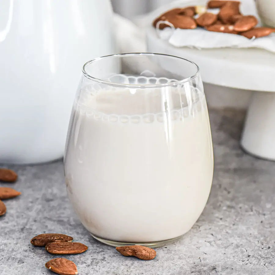 Für eine cremige Mandel- oder Hafermilch gib einfach 100 g Nüsse oder Haferflocken und 1 Liter Wasser in den Mixer.